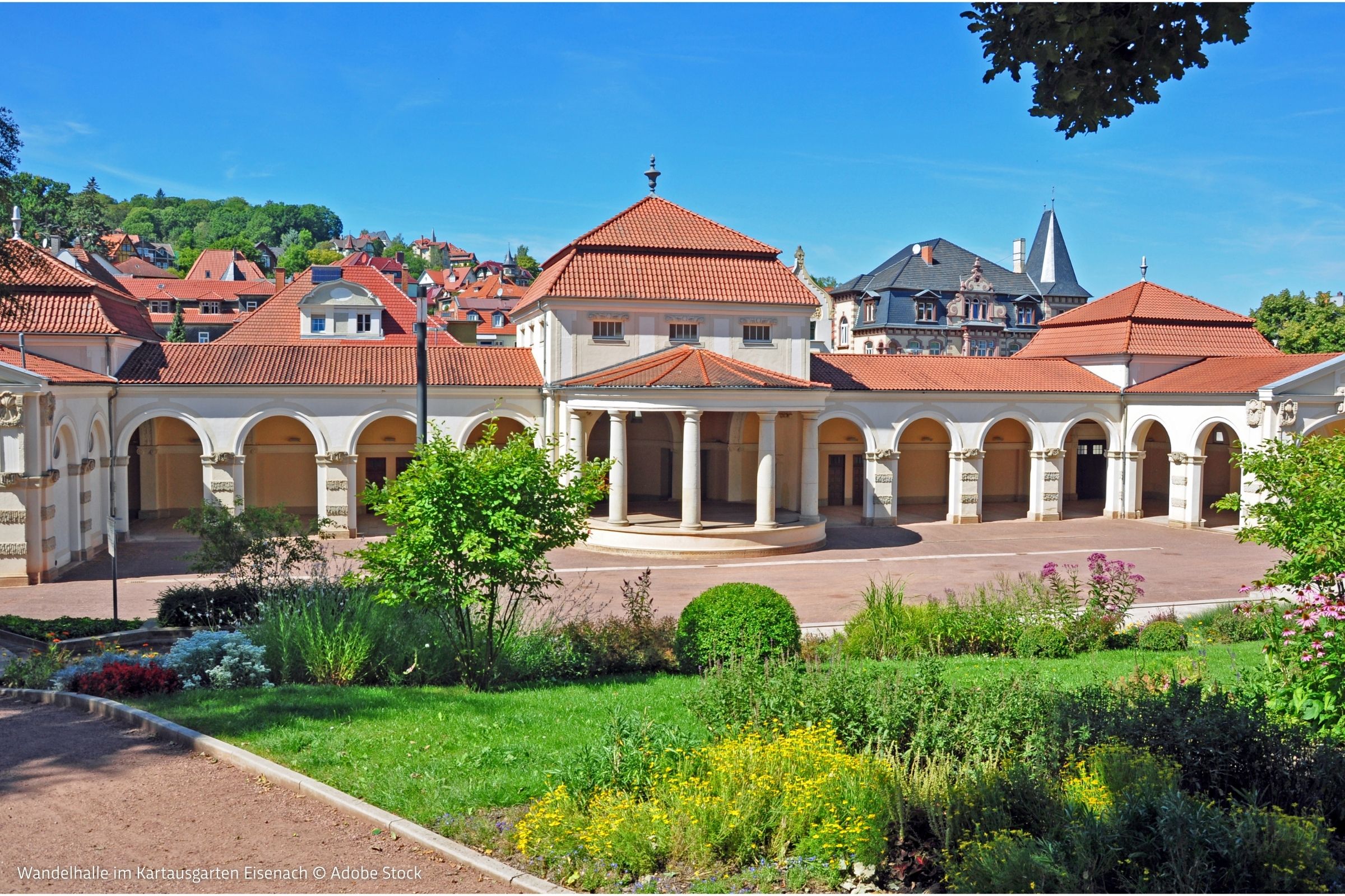 Gleich hinter der Wartburgallee öffnet sich der Kartausgarten, ein rund 3,8 Hektar großer Landschaftspark und damit der älteste botanische Garten Eisenachs. Dort befindet sich die prächtige Wandelhalle, die 1906 als Teil des einstigen Kurbetriebs eingeweiht wurde. Das salzhaltige Heilwasser stammte aus der Karolinenquelle, doch der Kurort war nur von kurzer Dauer – bereits 1938 endete der Betrieb.