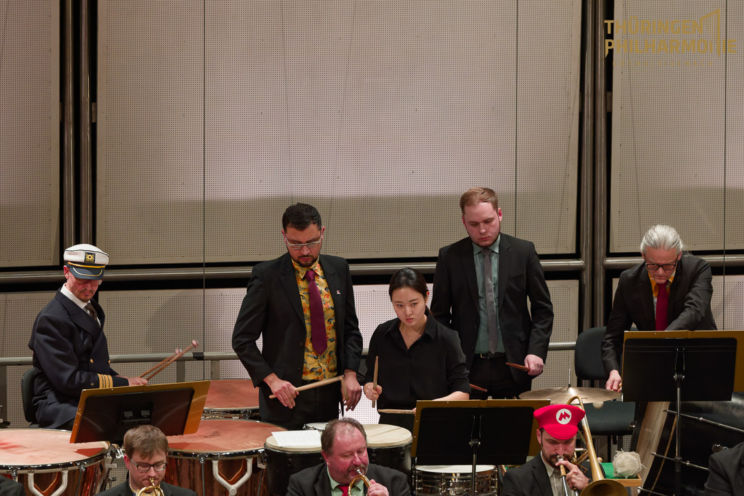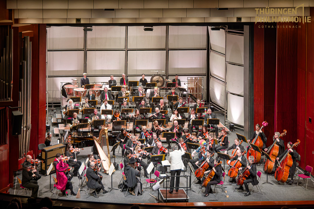 Zauberhaft schön und mystisch war unser Faschingskonzert im Gothaer Kulturhaus. Unter der Leitung von Russell Harris führte der musikalische Bogen von Beethoven über einen Feuertanz am Ende bis zu Harry Potter. Die grüngesichtige Hexe, die ihren Besen nicht mit dem Dirigenten teilen wollte, erwies sich als höchst talentierte Geigerin – oder Geiger, denn Konzertmeister Alexej Barchevitch versteckte sich hinter der Maske. Auch sonst gab es die eine oder andere Verkleidung im Orchester – und auch ein paar Zuschauerinnen und Zuschauer bekannten sich zur närrischen Jahreszeit. Der weißhaarige Waldschrat-Hornist war herrlich anzusehen. Zwei Zugaben gab es am Ende. Bei der letzten brillierte das Percussionsensemble mit markanten Trommel-Rhythmen.