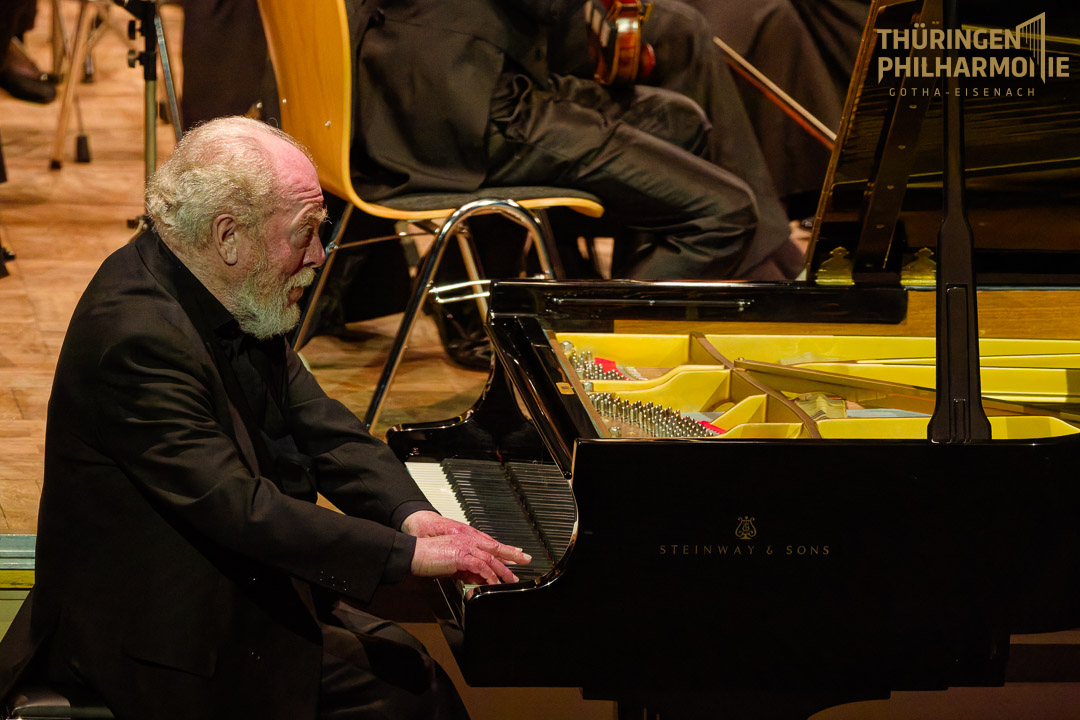 Gerhard Oppitz ist eine pianistische Legende, aber noch immer frisch, virtuos und dabei sehr bescheiden. Aus Platzgründen stand der große Flügel vor der Bühne, so dass es, wie Markus Huber in seiner Konzerteinführung sagte, ein Klaviersolo mit Orchesterbegleitung sei. Doch das Konzert für Klavier und Orchester Nr. 1 Es-Dur von Franz Liszt wurde dann doch ein überzeugendes Gesamtwerk mit großen musikalischen Bögen. Die vorzügliche Akustik der Stadthalle war dabei eine gute Unterstützung.